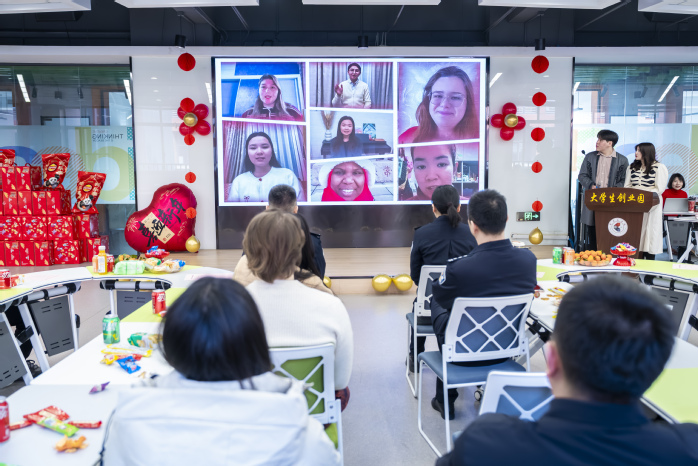 联欢会伊始,学院党委书记金政介绍出席嘉宾并致谢,大屏幕播放了各国留学生及校友发来的新春祝福视频。国际交流合作处处长金中坤致贺辞,送上马年祝福,与会嘉宾为外籍师生派发新春礼包并合影。