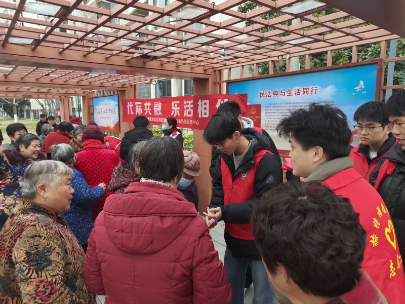 活动中,志愿者与社区社工、专业团队协作,在法治长廊搭建“一站式”服务阵地,聚焦长者需求提供多元服务:健康义诊区协助测血压血糖、解答健康疑问;反诈宣传角以情景剧+案例形式讲解防骗知识;知识宣讲区普及心理健康、红十字“三救三献”及博爱家园项目内容。同时,志愿者还参与长护险咨询引导、爱心理发秩序维护、签到及慰问礼发放等工作,以热情服务传递温暖。