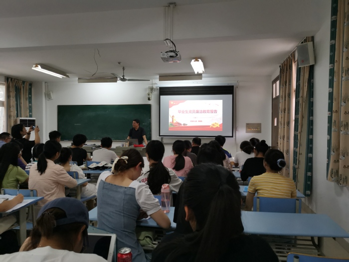 接着,校纪委副书记、纪委办公室主任姚国胜以《严守党纪国法 坚持廉洁从业》为主题,为即将离校的毕业生党员上了大学“最后一堂廉洁教育党课”,他要求毕业生党员必须要练好思想上的“内功”,要有守住廉洁自律的“防功”,要有划清公与私的“硬功”。同时他希望毕业生党员在今后的科研学习或工作实践中要以《党章》为遵循,以一个清正廉洁、积极进取的共产党员标准严格要求自己,牢固树立起廉洁为民的意识,树立新时代青年学生党员的良好形象,修身立德,廉洁自律,用自己的勤奋和努力谱写人生壮丽篇章。