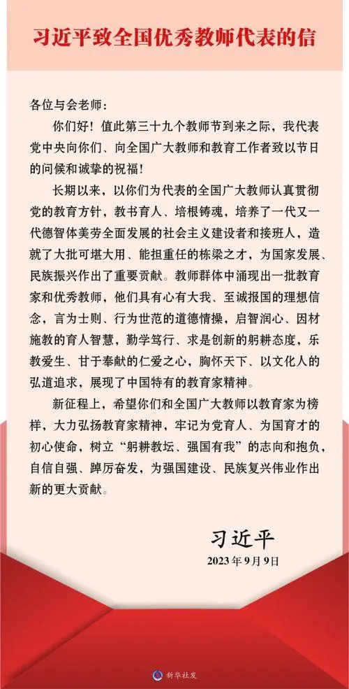在第三十九个教师节来临之际,中共中央总书记、国家主席、中央军委主席习近平9月9日致全国优秀教师代表的信,向他们和全国广大教师及教育工作者致以节日的问候和诚挚的祝福。