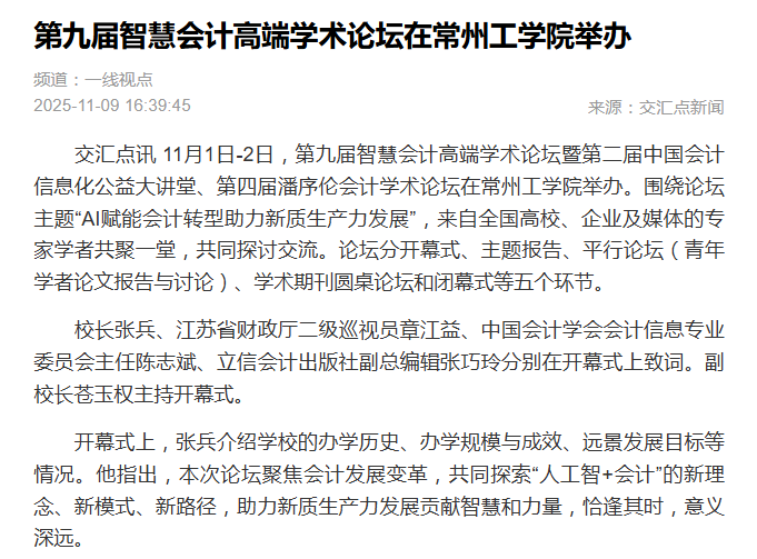 交汇点讯 11月1日-2日,第九届智慧会计高端学术论坛暨第二届中国会计信息化公益大讲堂、第四届潘序伦会计学术论坛在常州工学院举办。围绕论坛主题“AI赋能会计转型助力新质生产力发展”,来自全国高校、企业及媒体的专家学者共聚一堂,共同探讨交流。论坛分开幕式、主题报告、平行论坛(青年学者论文报告与讨论)、学术期刊圆桌论坛和闭幕式等五个环节。