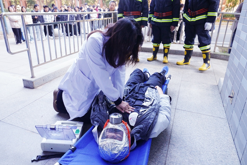 本次演练设“实验室消防事故应急处置”“应急疏散逃生”“触电人员救援”三个环节。模拟实验室用电过载引发火情后,师生沿预定路线有序撤离至安全区域,救援人员依规断电、用绝缘工具转移伤员并实施心肺复苏。整个救援过程反应迅速、处置规范。