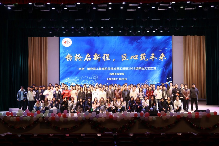 11月26日晚,机械工程学院在文化艺术中心举办“齿轮启新程,匠心筑未来”点亮辅导员工作室阶段性成果汇报暨2025级新生文艺汇演。学院党政领导、系部主任、新生班主任、辅导员及全体2025级本科生和研究生共同参与。