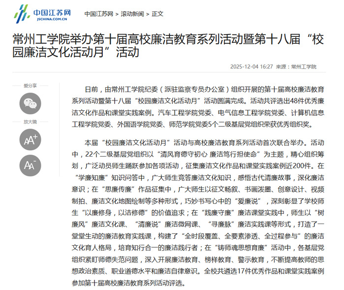 日前,由常州工学院纪委(派驻监察专员办公室)组织开展的第十届高校廉洁教育系列活动暨第十八届“校园廉洁文化活动月”活动圆满完成。活动共评选出48件优秀廉洁文化作品和课堂实践案例。汽车工程学院党委、电气信息工程学院党委、计算机信息工程学院党委、外国语学院党委、师范学院党委5个二级基层党组织荣获优秀组织奖。