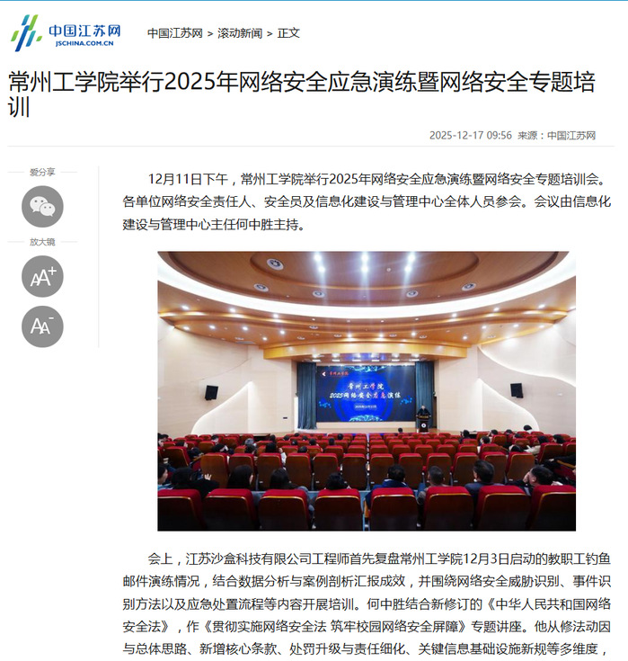 12月11日下午,常州工学院举行2025年网络安全应急演练暨网络安全专题培训会。各单位网络安全责任人、安全员及信息化建设与管理中心全体人员参会。会议由信息化建设与管理中心主任何中胜主持。