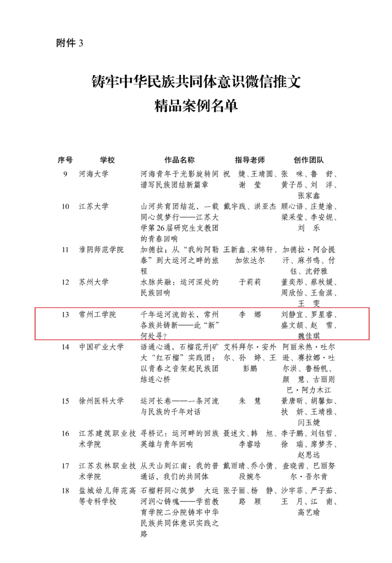 近日,江苏省民族宗教事务委员会、中共江苏省委宣传部、中共江苏省委统一战线工作部、江苏省教育厅联合公布了江苏省第三届“铸牢中华民族共同体意识·高校在行动”系列活动“微信推文精品案例名单”,我校经济与管理学院刘静宜等5名学生(指导老师:李娜)创作的微信推文《千年运河流韵长,常州各族共铸新——此“新”何处寻?》成功入选。