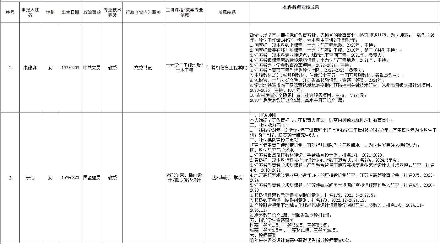 依据选拔条件,经个人申报,二级学院推荐,相关部门审核,专家评选,学校审议,拟确定朱建群教授、于洁教授为我校“2026年江苏省教学名师”推荐申报人选,现予以公示。
